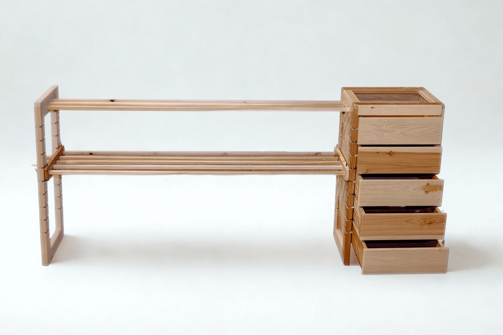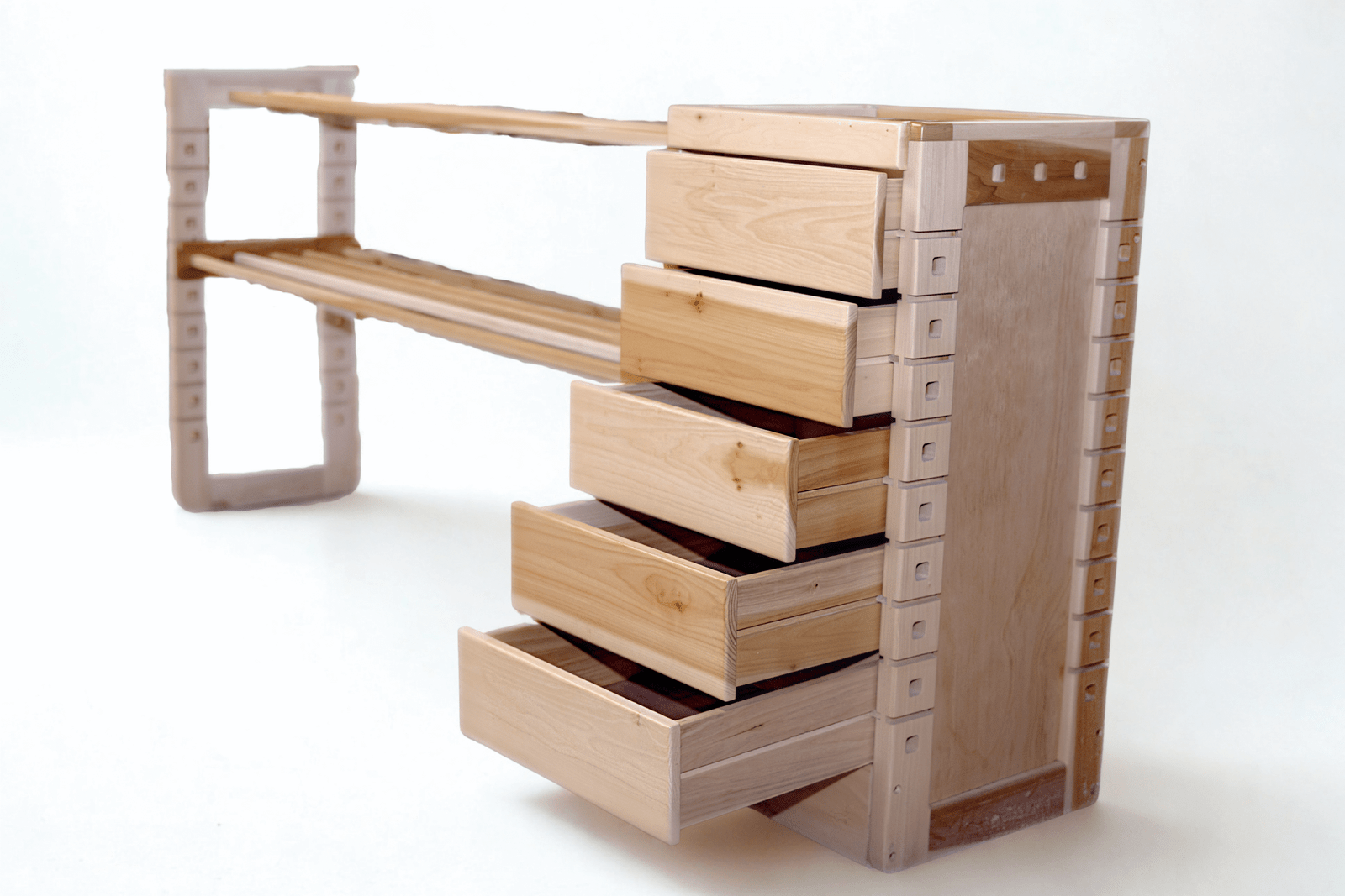 Escritorio multifuncional con 1 Arturito y una cajonera Quimera con plancha de madera solida y 5 bastones.